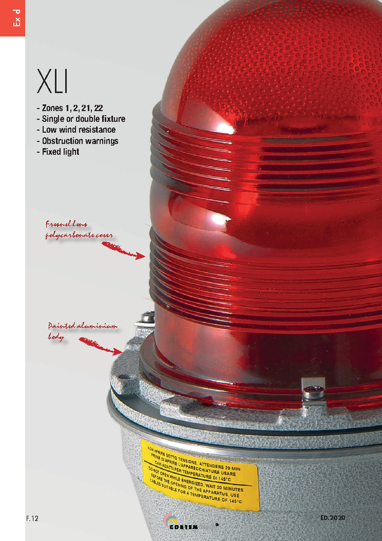 Les luminaires d'obstacles fixes de la série XLI sont idéaux pour les cheminées, les cheminées, les bâtiments hauts, les grues, les ponts, les mâts de radio/télévision, les pylônes de lignes électriques, les éoliennes, les antennes radar et de télécommunication et spécifiquement pour une utilisation dans les industries pétrochimique et pétrolière.